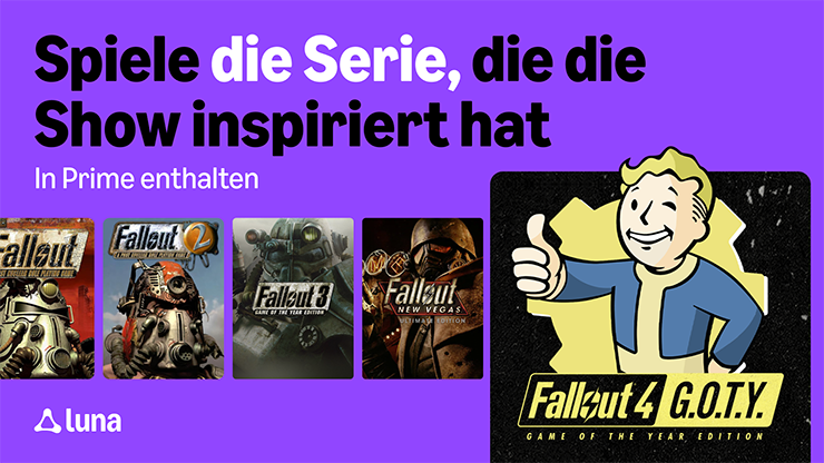 Die zweite Staffel der mit einem Emmy ausgezeichneten Serie Fallout, produziert von Kilter Films, die ab 17. Dezember auf Prime Video zu sehen ist, ist der perfekte Grund für die Rückkehr ins Ödland. Tauche wieder ins Universum von Fallout ein und feiere die lang erwartete Staffelpremiere. Prime-Mitglieder erhalten diesen Monat Zugriff auf mehrere postapokalyptische Abenteuer am brandneuen Amazon Luna.