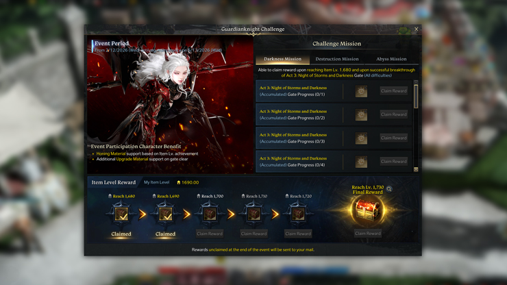 The Guardianknight Challenge layers in many additional progression materials to help boost the designated character through two main vectors: Item Level Complete rewards and Mission Rewards.