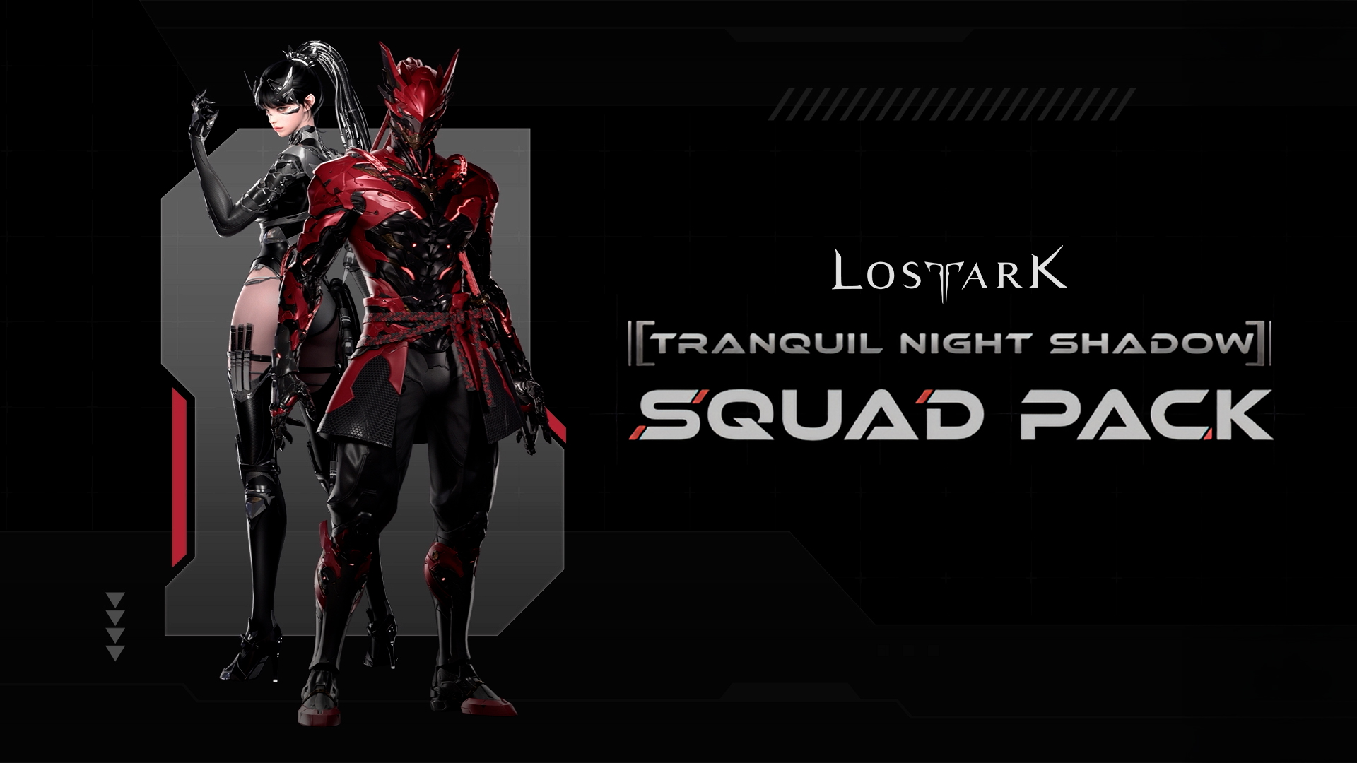 Round out your look with the Tranquil Night Shadow armor set, the Fenrir Mount, and the PR-C Pet — all part of a sleek new cybernetic-themed collection in red, black, and silver.