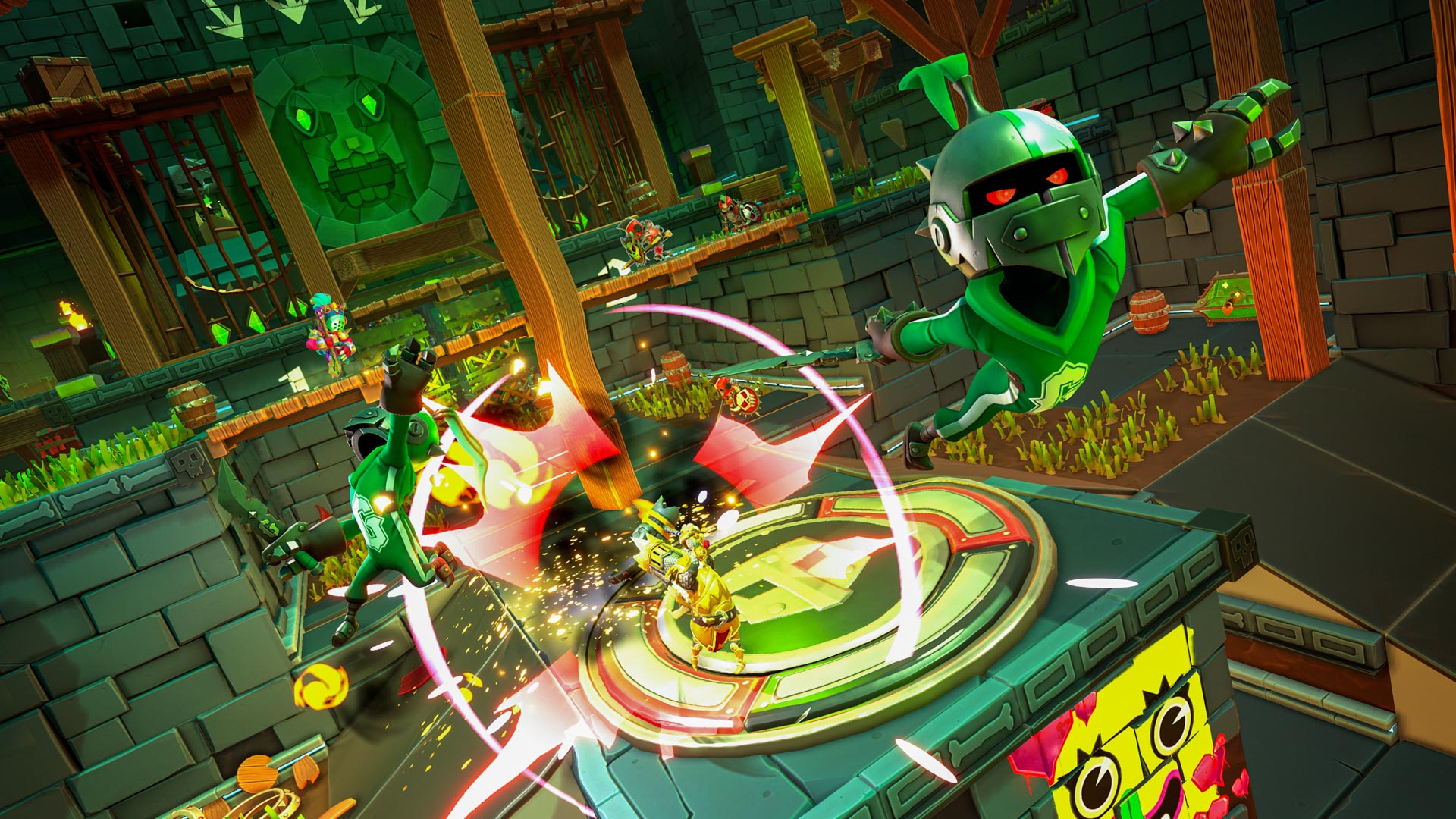 As a contender, players will battle through joyfully unhinged dungeons with a team of up to four to be crowned victorious. As players progress and their fame rises, it unlocks new leagues, environments, traps and challenges to beat. With an audience to impress, players must utilise weapons, combos, and over-the-top Glory Moves to complete dungeons in the most imaginative ways.