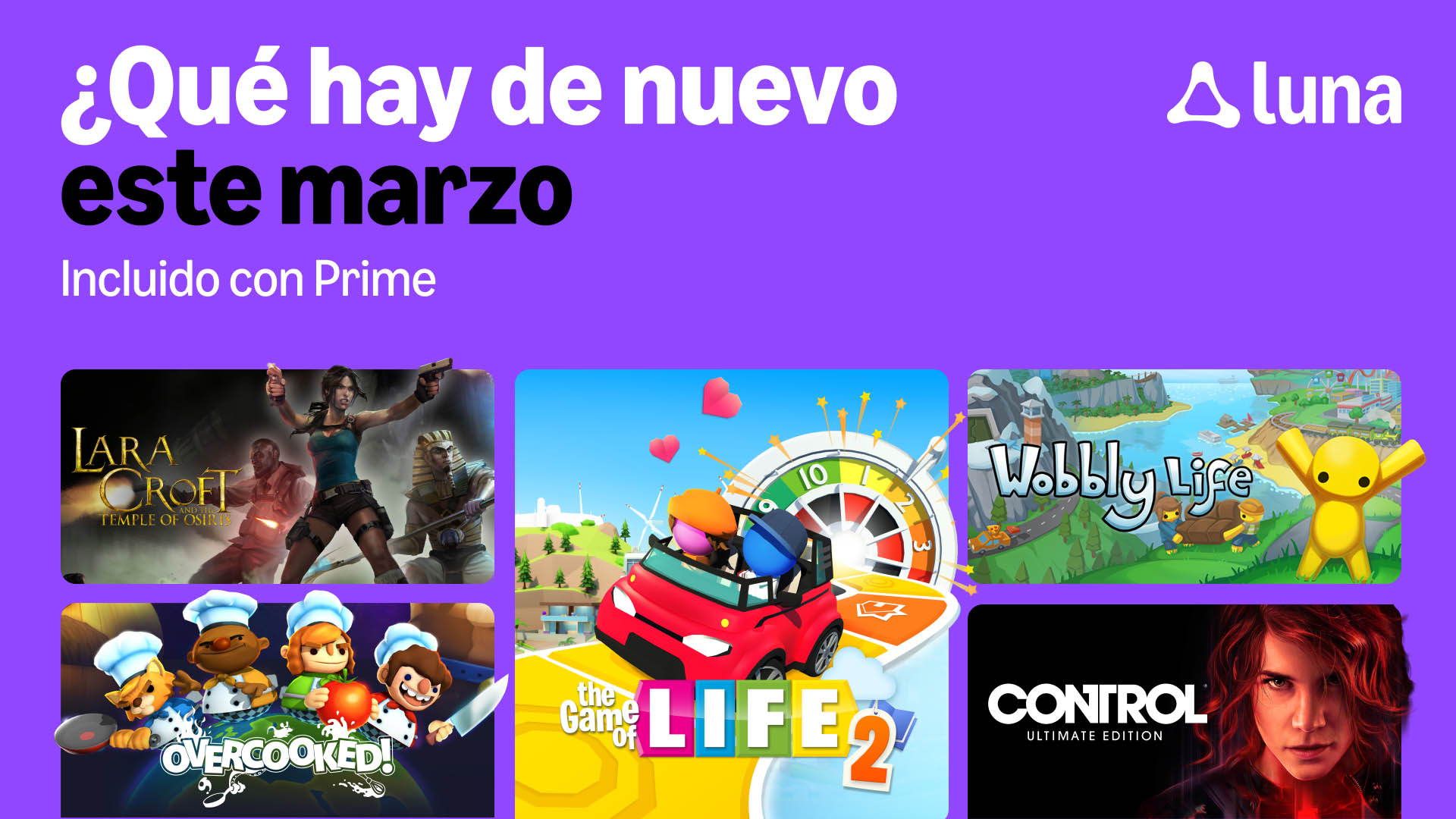 Luna ofrece varios títulos adicionales para los miembros Prime durante todo el mes de marzo, ¡y los primeros juegos ya están disponibles desde hoy! Estos títulos se suman a la biblioteca de más de 50 juegos disponible para los miembros Prime. Entre otros títulos, la selección de este mes incluye una gran cantidad de juegos multijugador. Como si el modo cooperativo para cuatro jugadores de Lara Croft and the Temple of Osiris no fuera suficiente, Luna también da la bienvenida a la diversión de los juegos familiares con The Game of Life 2, y más éxitos multijugador como Wobbly Life, Overcooked!, y House of Golf 2. Visita regularmente en luna.amazon.com para ver la biblioteca completa disponible.
